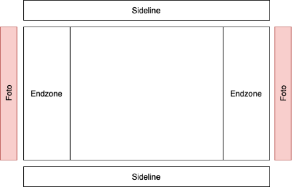 Am Besten stirnseitig bei der Endzone, nahe an einer Ecke (bessere Übersicht) = 2 Fotografen optimal in jeder Endzone. Mitte supobtimal, Sideline gehört den Sportlern, ggf. erhöht dahinter Fotografieren Am Besten mit Sonne im Rücken fotografieren, kein Blitz verwenden (stört Sportler). Standort ab und zu wechseln (verschiedene Perspektiven). Oft ist es Glücksache und man ist zur richtigen Zeit am richtigen Ort.